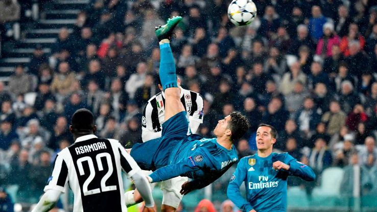 As the ball rose, so did Cristiano Ronaldo. He turned a little and then jumped — high. His body, sideways on, pretty much parallel to the floor, was more than a metre above the ground when he connected with the overhead kick, left leg thrust up first then right leg passing it on the way to the ball, foot striking it in the air. Falling now, he hit the turf at the Juventus Stadium about the same time as the ball hit the post with a thud that could be heard by everyone there, cutting through the quiet. It was the night before the Champions League quarterfinal and the place was almost empty. It was only a training session, just practice.