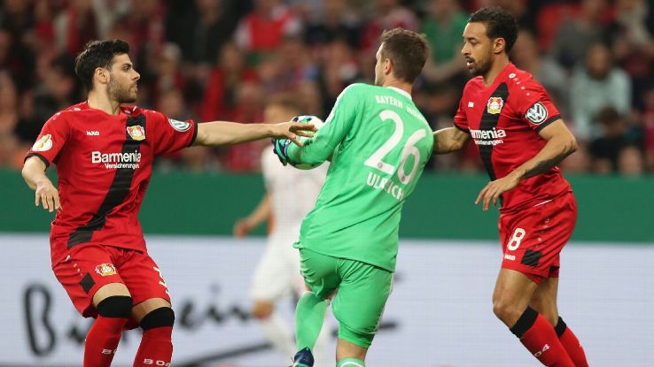 However, Leverkusen hit back through a Lars Bender header seven minutes later and Ulreich had to be at his best to deny an equaliser to German internationals Kevin Volland and Karim Bellarabi (twice).