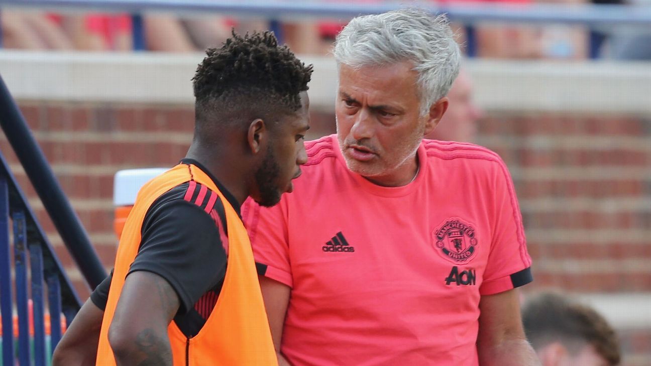Jose Mourinho talks with Fred during Manchester United’s International Champions Cup loss to Liverpool.