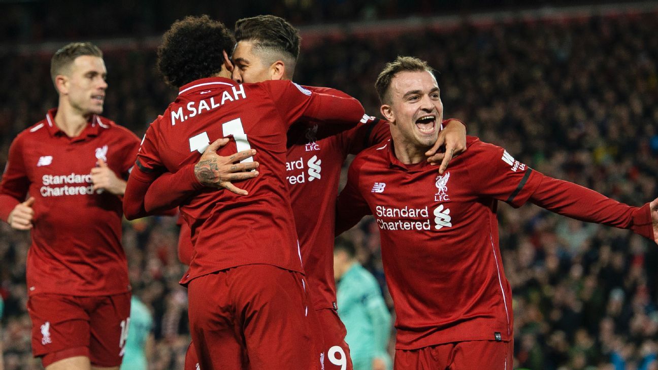 Mohamed Salah and Roberto Firmino celebrate one of Liverpool’s five goals on Saturday.
